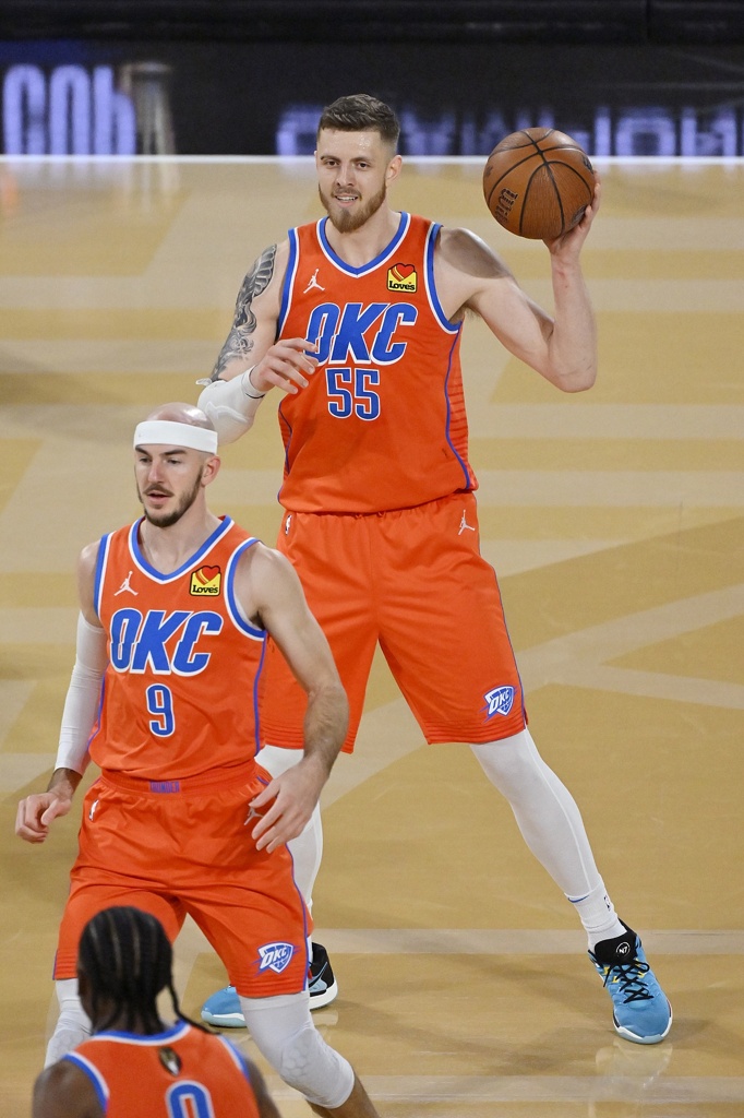 雷霆侧翼虽然整体的体型偏小,但能把轮转速率拉满,在哈滕和霍姆格伦缺阵的日子,玩五小阵容的雷霆依然交出了恐怖的防守表现。他们凭借防守伸缩性、压迫性和轮转纪律打出了联盟最好的防守效率,四两拨千斤,把机动灵活演绎到了极致。