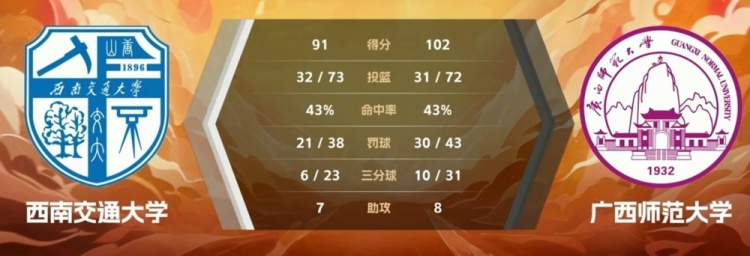 末节比赛,西安交大在前半节还能勉强咬住比分,但之后他们的进攻就遇到大麻烦,广西师大直接将分差再次拉开到十分以上,比赛就此失去悬念,最终广西师大102-91力克西南交大拿下首胜。