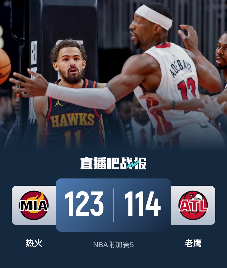 比赛上来,热火就在两分半的时间里轰出10-0的完美开局,暂停回来特雷-杨造杀伤终于为老鹰打破僵局,老鹰此后虽有反扑势头但无法获得反超机会,次节特雷-杨的进攻表现依旧不好,好在是尼昂在替补席站了出来才勉强帮助球队咬住比分,半场结束时热火还领先9分;下半场回来,热火多次出现失误被老鹰打反击,分差最小时仅剩3分,好在是挑战后热火连拿六分给出回应,末节老鹰卷土重来,在五分钟的时间里轰出16-4的攻势终于完成反超,关键时刻尼昂没能打进,海史密斯拿到关键篮板,希罗两罚中一给对手留下机会,特雷-杨挑篮追平,维金斯绝杀三分不中比赛进入加时,加时赛双方攻势凶猛,希罗和米切尔更是连中三分,老鹰虽有回应但还是火力不足败下阵来,最终热火加时力克锁定东部第八。