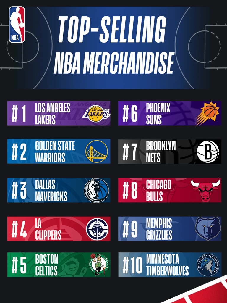 湖人在球队授权产品销售榜中拿下了冠军,排名第二和第三的分别是勇士和独行侠。