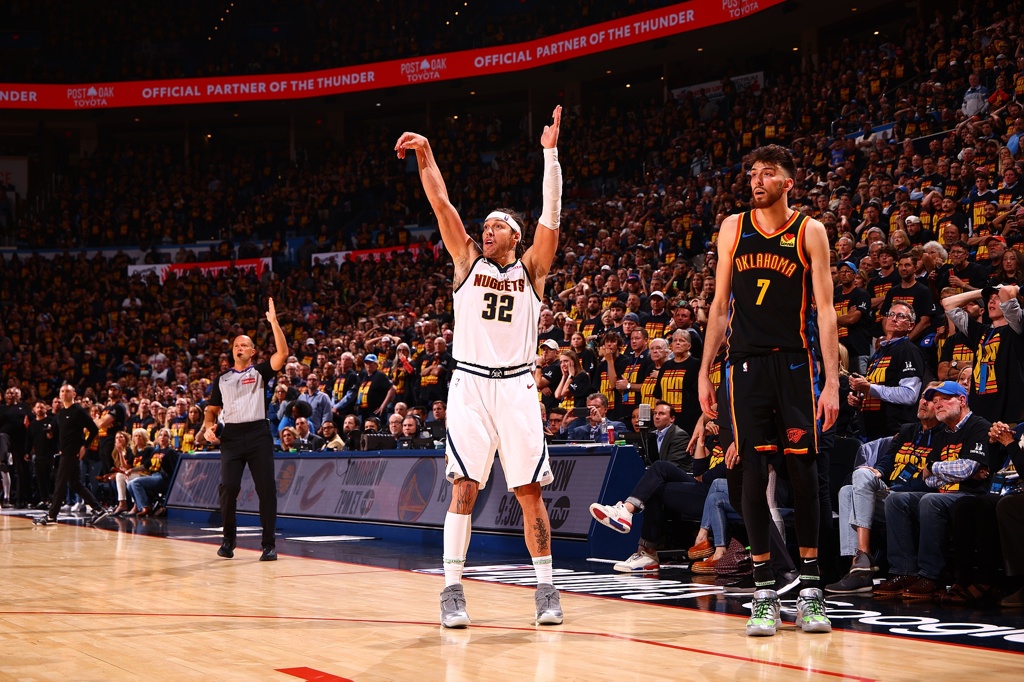 既然雷霆如此凶悍明牌包夹约老师,掘金的弱侧空位定点三分回应率自然是破解包夹和联防的晴雨表。