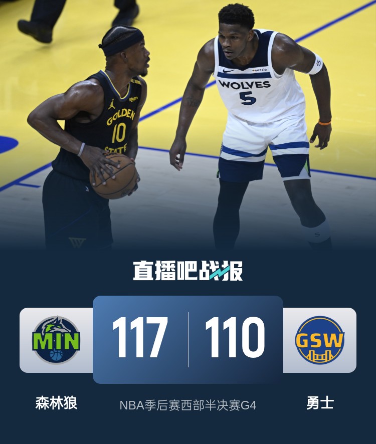 比赛上来,勇士先拿五分取得领先,不过森林狼立马就追了回来,两队此后展开漫长的拉锯战,场上比分交替领先,次节森林狼一度占据主动并拉开分差,但顽强的勇士还是咬住比分并在节末利用一波10-0完成反超,半场结束时森林狼落后2分;下半场回来,爱德华兹连中三分带队轰出一波17-0的攻势,这一节勇士只拿到17分净负22分,更是被反超20分进入末节,最后一节勇士也没有再获得任何逆转比赛的机会,最终森林狼轻取勇士,大比分3-1获得赛点。