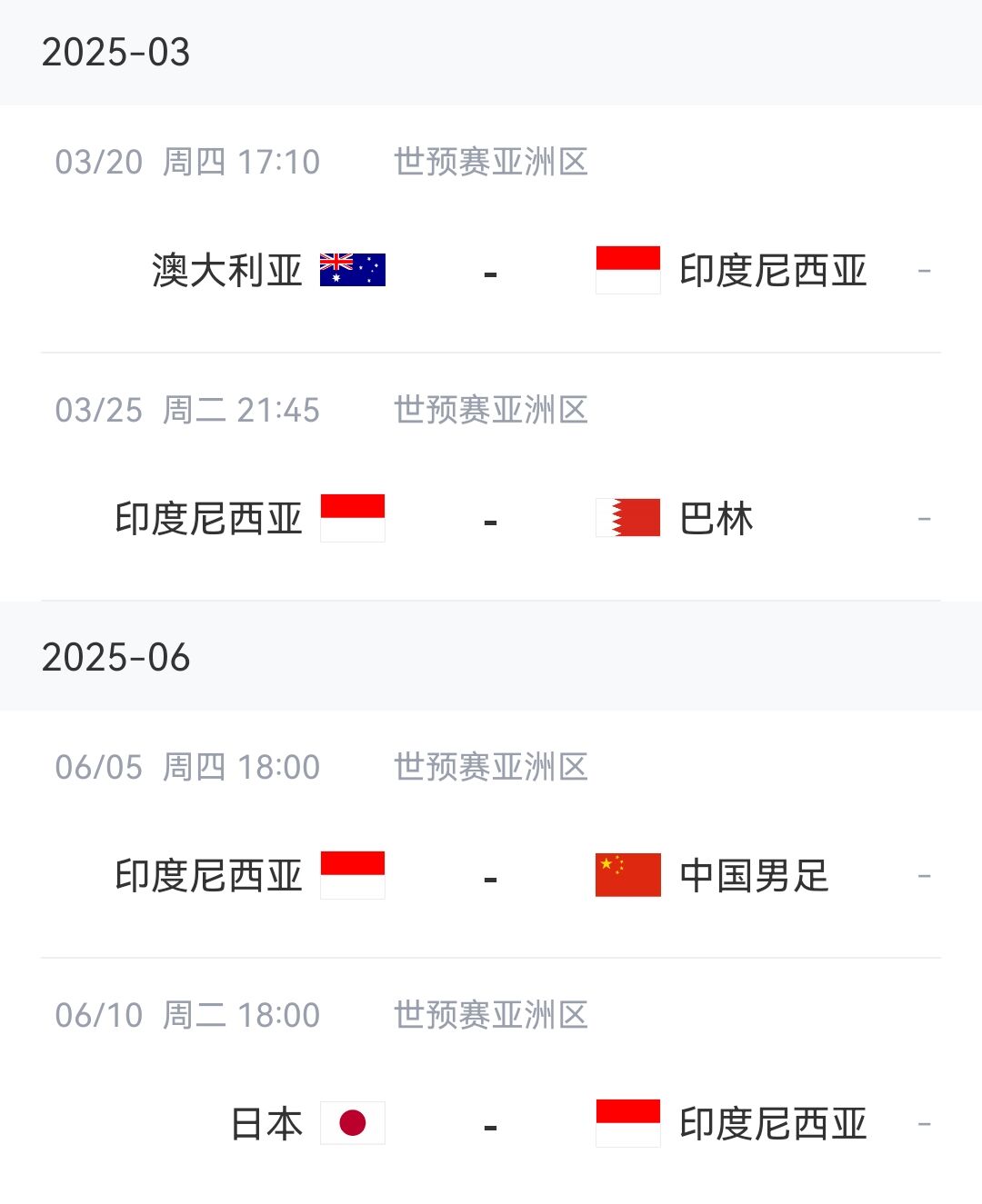 目前印尼在小组中排名积6分第3,本月他们将对阵澳大利亚和巴林。