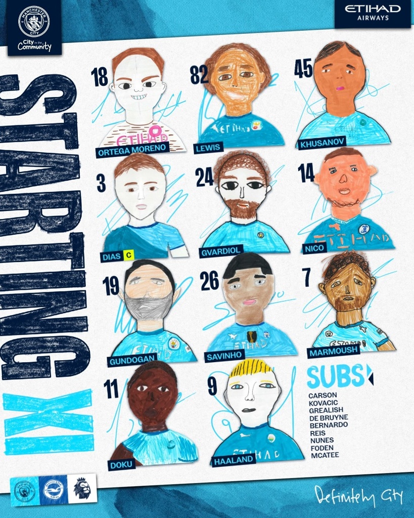 曼城首发:18-奥尔特加、3-鲁本-迪亚斯、24-格瓦迪奥尔、45-胡桑诺夫、82-刘易斯、14-尼科-冈萨雷斯、19-京多安、7-马尔穆什、9-哈兰德、11-多库、26-萨维尼奥