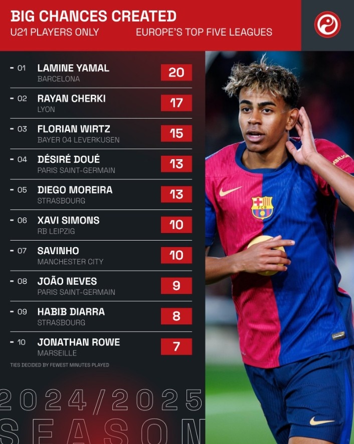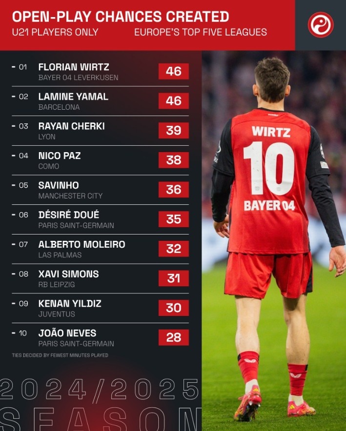 3月27日讯 《Squawka》统计出了本赛季创造重大机会最多的五大联赛U21球员top10,亚马尔以20次居首,至于运动战创造机会方面,维尔茨和亚马尔则以46次并列榜首。
