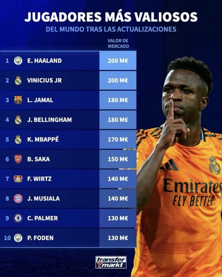4月7日讯 德国转会市场列出世界足球员身价最高的前十名单,其中哈兰德和维尼修斯2亿欧居首,亚马尔和贝林厄姆1.8亿并列,姆巴佩1.7亿排名第五。