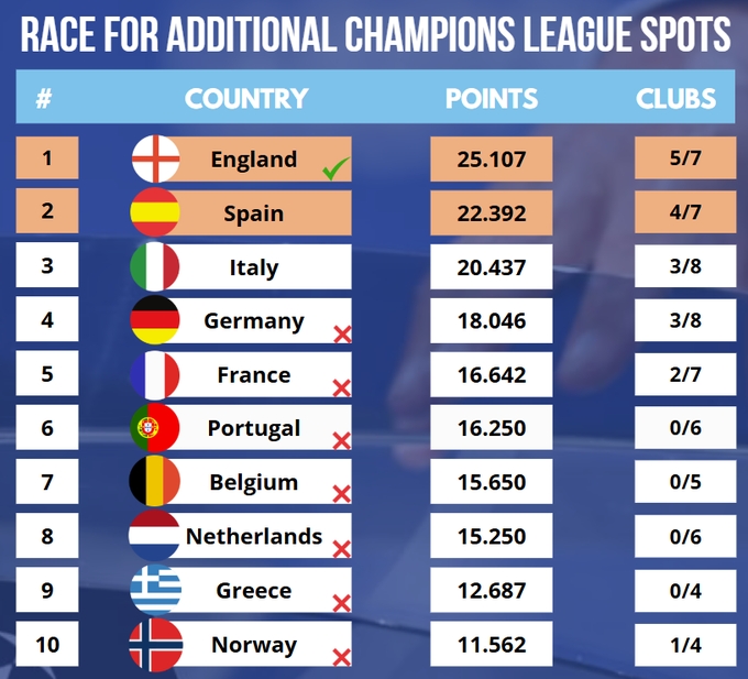 24/25赛季各联赛欧战积分(前2名获额外欧冠名额):