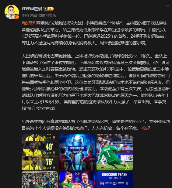 04月16日讯 欧冠1/4决赛次回合2场战罢,巴萨、巴黎双双输球晋级四强。评述员詹俊在社媒做出点评。