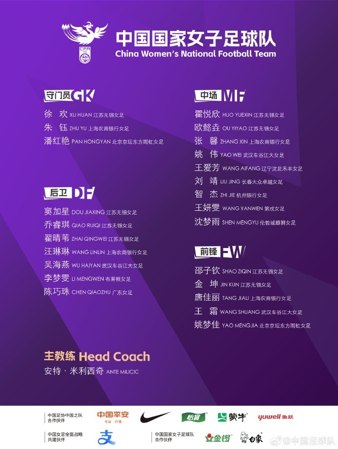 前锋:邵子钦、金坤、唐佳丽、王霜、姚梦佳