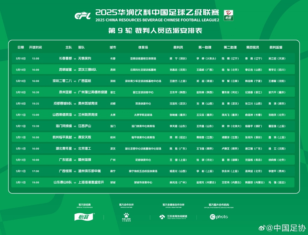 05月10日讯 中国足协公布了中乙第9轮裁判人员选派名单,姬晨光执法广西vs温州,王健执法铭途vs赣州,具体名单如下: