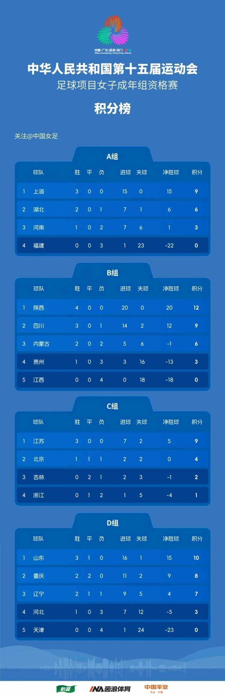 北京时间5月9日,中华人民共和国第十五届全国运动会足球项目女子成年组资格赛全部结束。在最后一轮资格赛三场决定晋级名额的比赛中,重庆女足3比1击败河北女足,河南女足7比1战胜福建女足,顺利获得晋级资格。吉林女足1比1与浙江女足战成平局,这个结果让两支球队同时遭到淘汰。