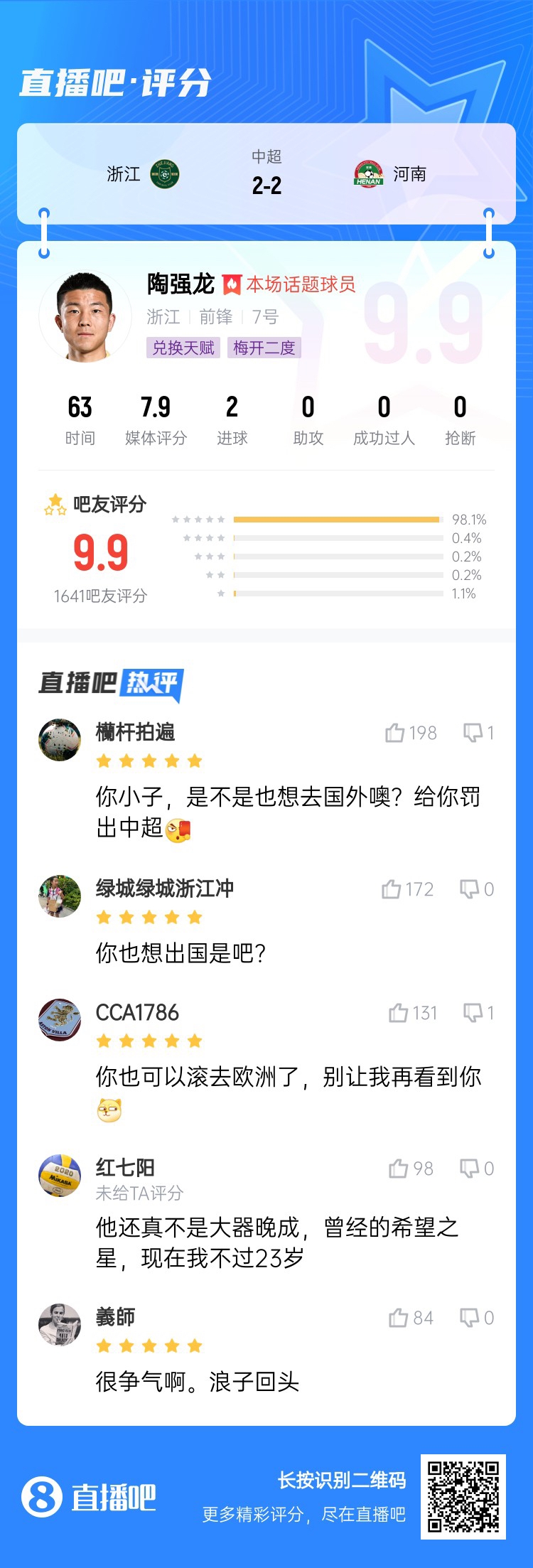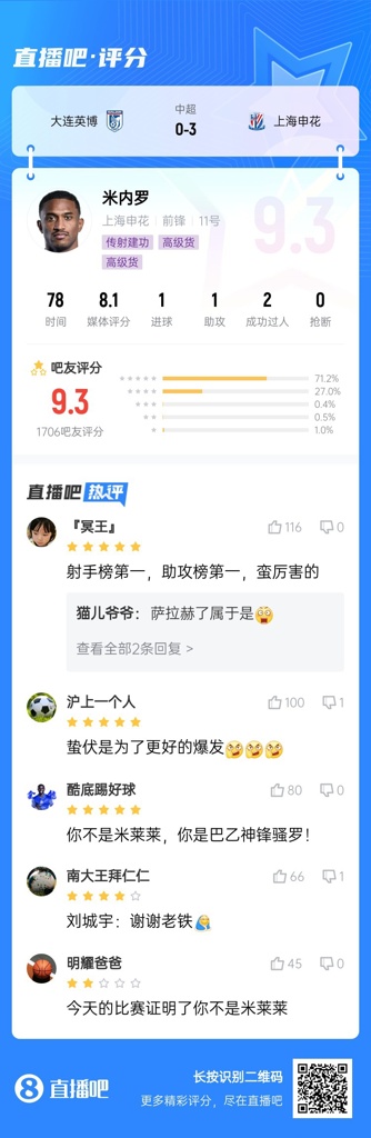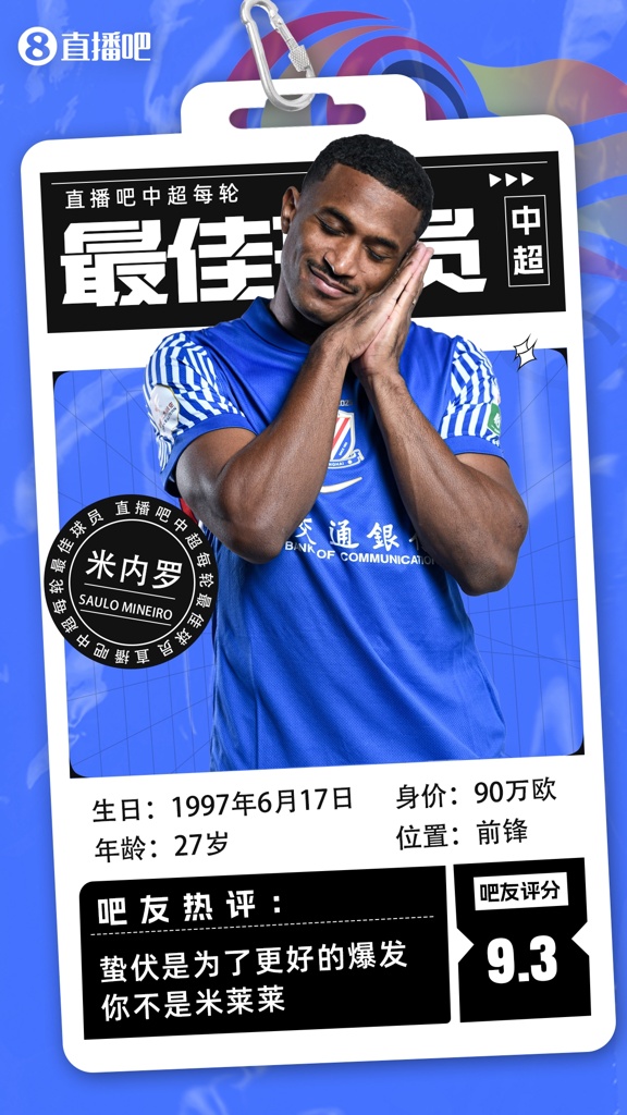 【】中超第13轮最佳球员评选结果揭晓,米内罗以0.2%微弱优势险胜陶强龙,首次当选本轮最佳!