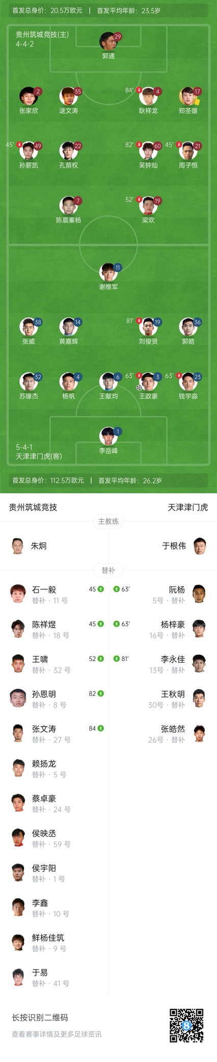 5月21日讯 北京时间5月21日晚上20:00,足协杯第3轮,贵州筑城竞技坐镇主场迎战天津津门虎。上半场,王政豪头球破门。下半场,双方均无建树。全场结束,贵州筑城竞技0-1天津津门虎。至此,天津津门虎晋级下一轮。