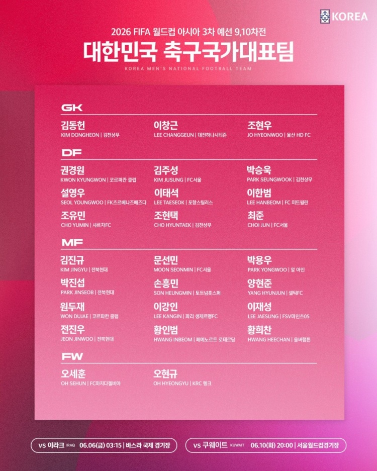 5月26日讯 今日,韩国队公布了最新一期国家队大名单,孙兴慜、李刚仁、黄喜灿领衔,金玟哉缺席。