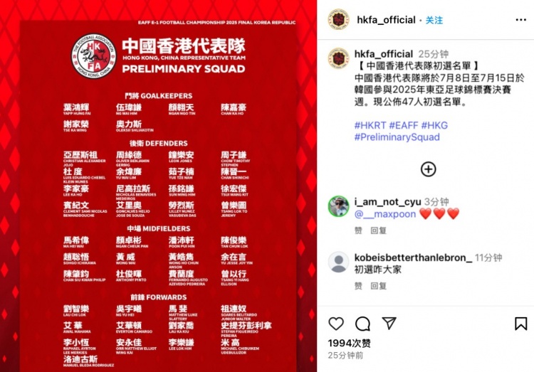 6月17日讯 今日,中国香港代表队官方公布了球队征战东亚杯的47人初选名单,包括陈晋一、李小恒、周缘德、孙铭谦、徐宏杰等多名效力中超、中甲的球员入选。具体如下: