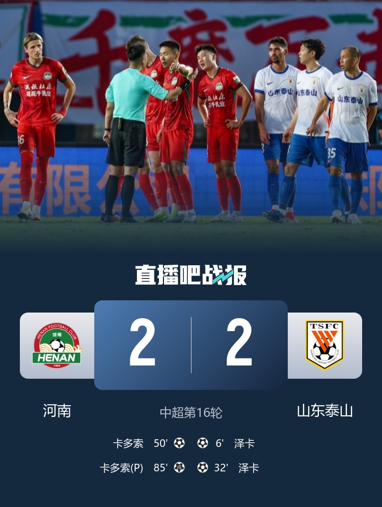 第76分钟,河南获得点球!阿奇姆彭禁区左路被马德鲁加放倒裁判判罚禁区外任意球,随后经过var反复回看裁判判罚点球,卡多索主罚点球破门,河南2-2山东泰山。↓